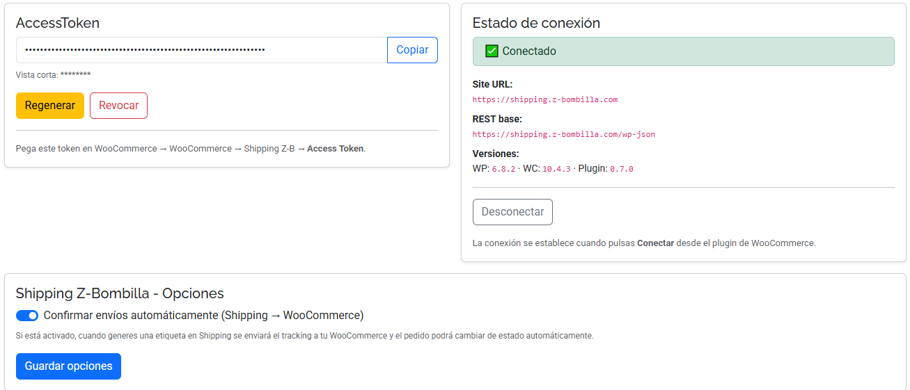 Importante: el AccessToken es el mismo que usa Shipping Z-B, si ya lo tienes configurado allí normalmente aquí aparecerá automáticamente.