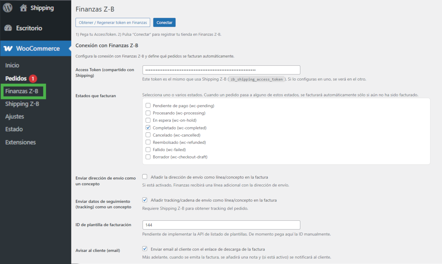 Este módulo conecta tu WooCommerce con Finanzas Z-B para generar facturas de forma automática cuando el pedido entra en los estados que tú elijas.