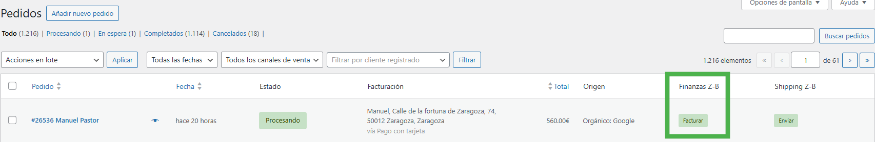 En el listado de pedidos verás la columna “Finanzas Z-B” con acciones como “Factura” y