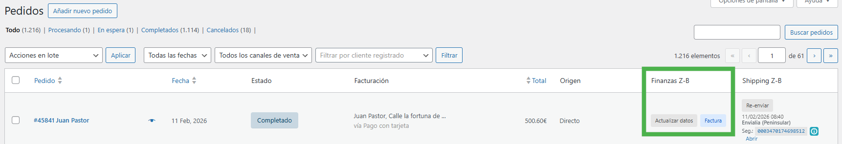 En la lista de pedidos verás la columna Finanzas Z-B, según el estado y si ya está facturado aparecerán acciones como Factura o Actualizar datos.