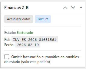 Dentro del pedido verás un bloque de Finanzas Z-B con el estado, si está facturado verás la referencia y la fecha