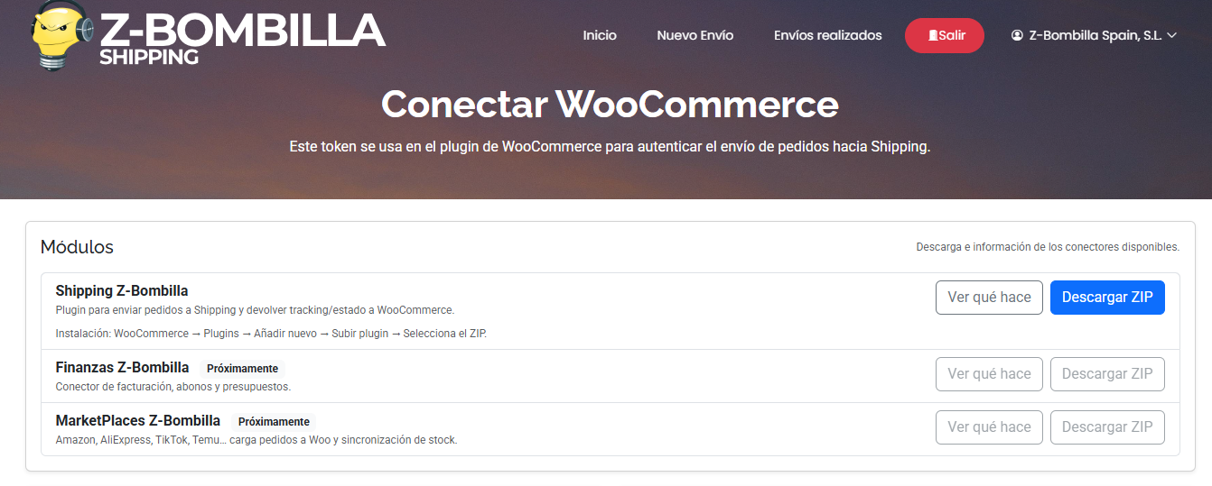 Desde tu panel de Z-Bombilla (Finanzas/Shipping), entra en E-Commerces → WooCommerce y descarga el ZIP del módulo Finanzas Z-B.